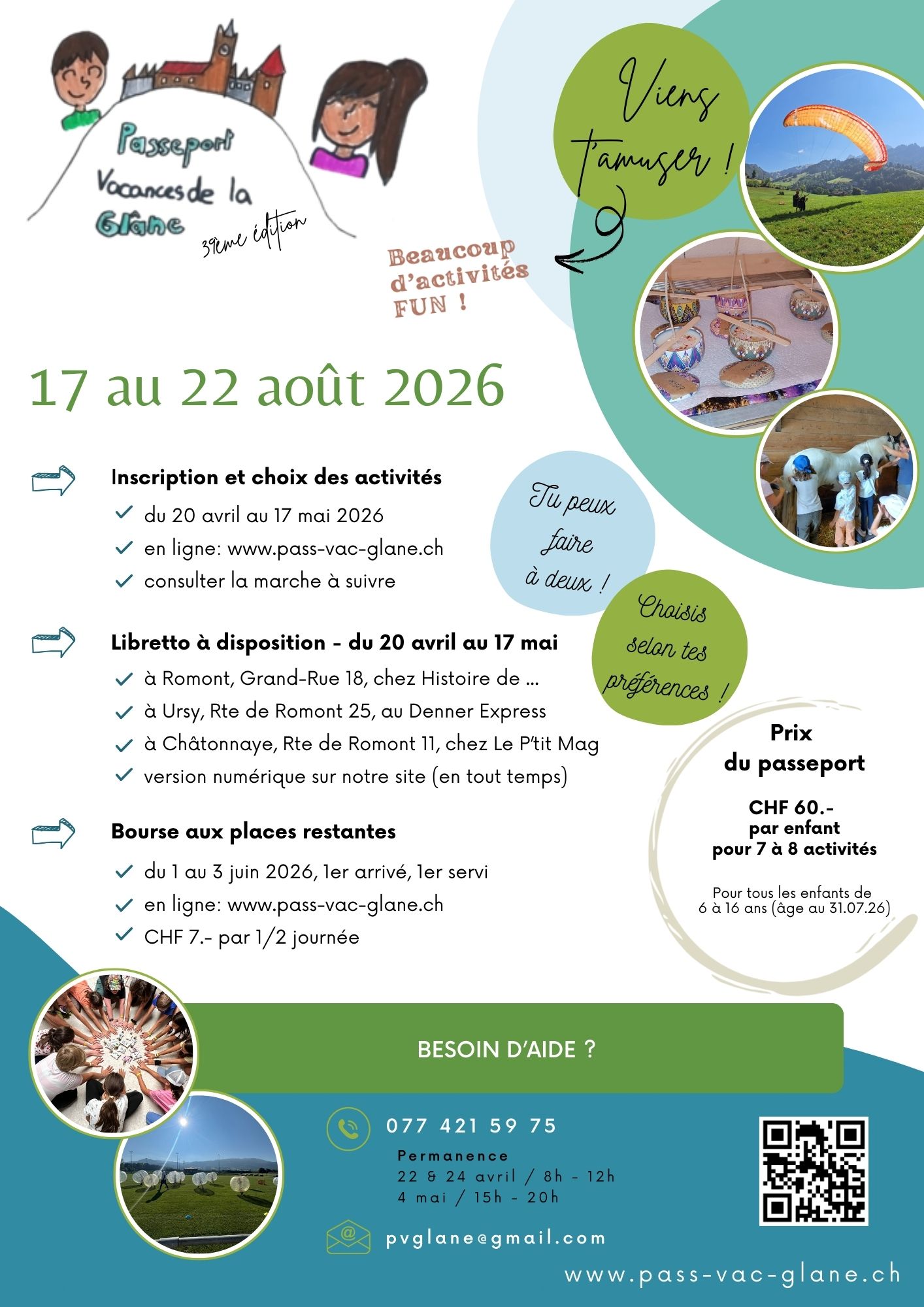 L'association est heureuse de pouvoir proposer aux enfants Glânois un large choix d’activités riche et varié du 17 au 22 août 2026.